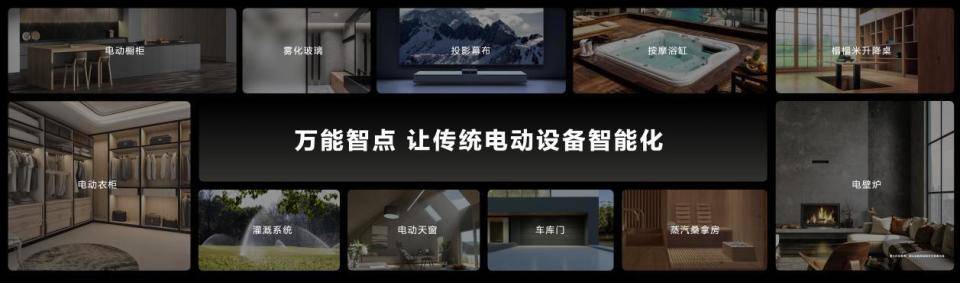 万能智点还可帮助用户打造智慧影音室、智慧庭院、车家联动等丰富的智慧场景。在智慧庭院场景中,室外照明可以实现百灯齐控,阳光房遮阳配合灯光氛围和天蓬帘、防风卷帘实现场景触发,智能喷灌、驱蚊可以定时开关、远程控制,打理庭院更加轻松省心。在智慧影音室,原来需要逐一打开的幕布、音箱、功放等设备,可实现一键观影联动、或AI传感自动触发,让享受即刻到来。在车家联动场景中,在车上就能通过语音提前开灯/凉房,待车进入地理围栏,自动触发预约凉房等智能场景,自动启动车库门,让回家充满仪式感。