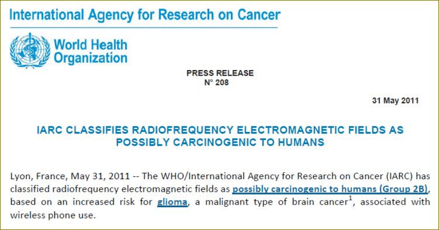 ▎2011年5月,世界卫生组织的专门癌症机构国际癌症研究机构 (IARC) 将射频辐射 (RFR) 归类为“可能对人类致癌(2B 类)”,因为它会增加患癌症的风险