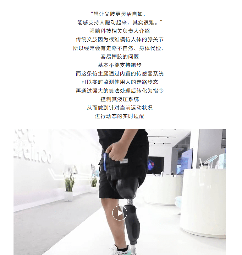 此外,据“仿生腿”的制造商 —— 杭州的一家高新科技企业“强脑科技”相关负责人介绍,“仿生腿”基于脑机接口技术,内置传感器,可实时监测、使用人的走路步态,通过算法处理之后转化为指令来控制液压系统,从而对当前运动状况进行动态适配。