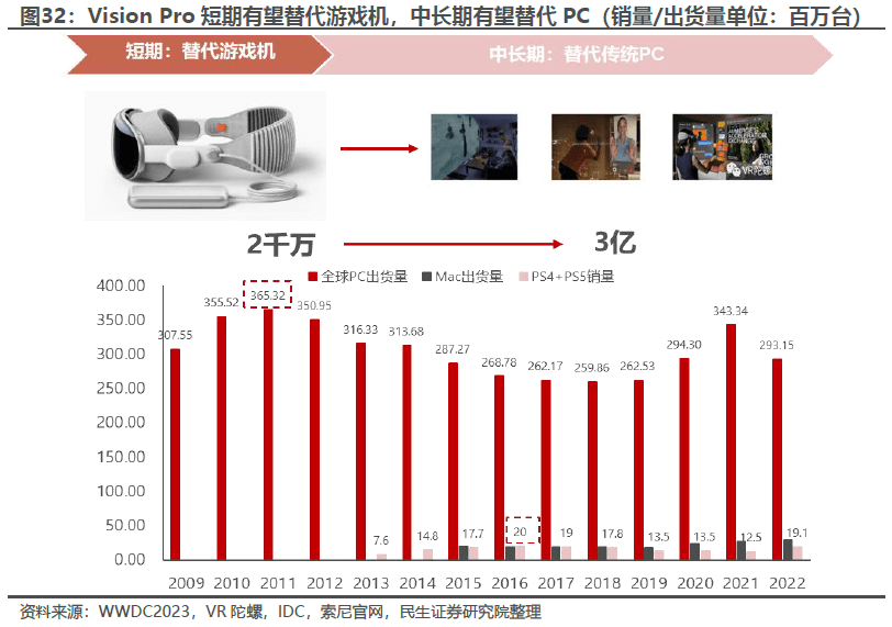 苹果CEO库克表示,“如同Mac将我们带入个人计算时代,iPhone将我们带入移动计算时代,Apple Vision Pro将带我们进入空间计算时代”。传统VR设备如Quest系列更多将应用集中于游戏、影音等娱乐场景,苹果VisionPro从游戏机的“枷锁”里面突破,借助苹果自身生态系统优势,使其与iphone、pad、Mac等其他设备保持同步,应用场景泛化至社交、办公、生活等领域。方竞等人认为Vision Pro短期有望替代传统游戏机,中长期有望替代传统PC。
