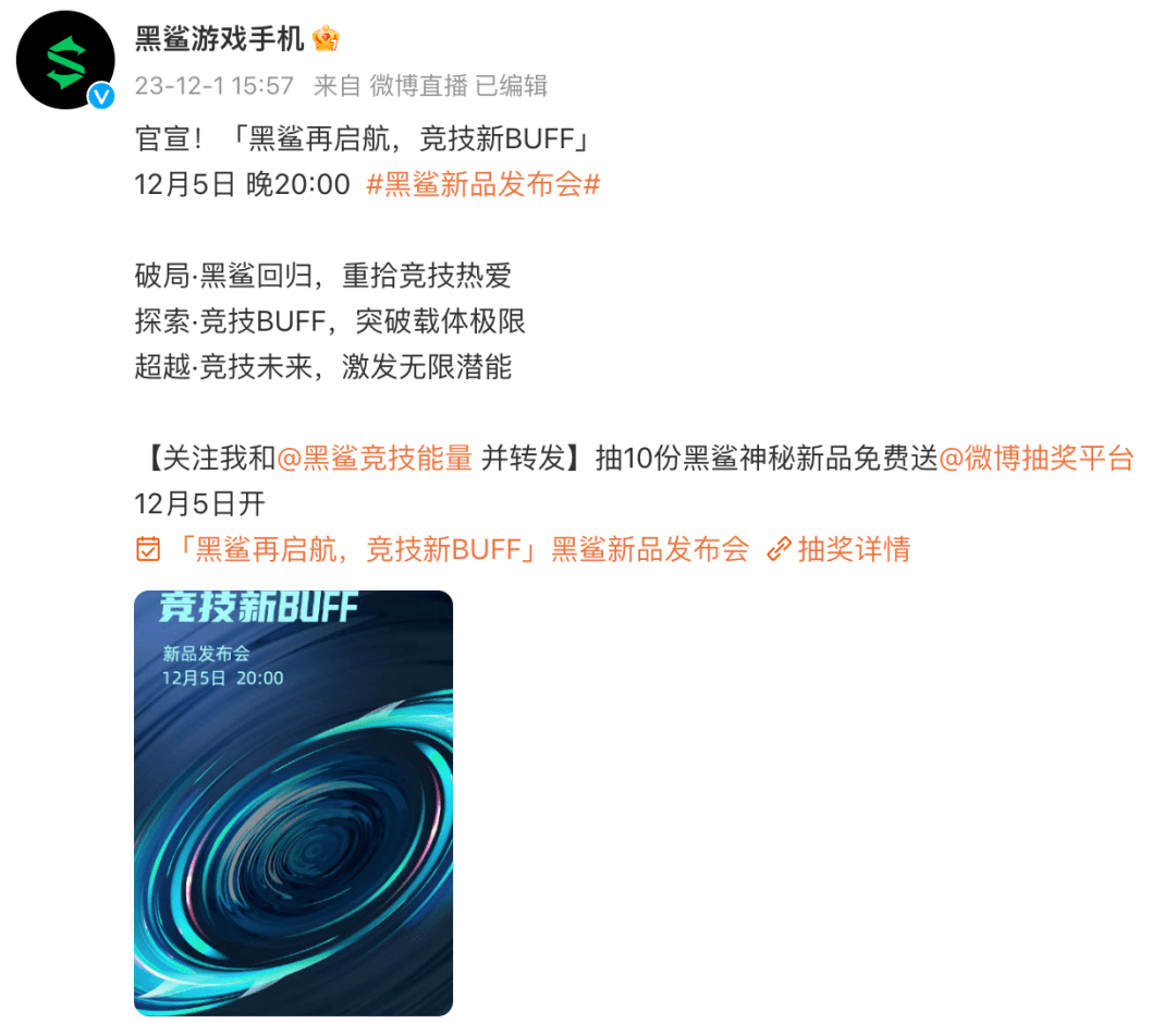 黑鲨新品发布会将于12月5日20:00举行,目前暂时不确定是手机芯片还是散热背夹等配件类产品,手机几率应该不大,大家觉得有可能会是什么?