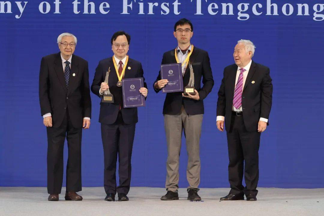 卢煜明(左二)和张锋获得首届“腾冲科学大奖”,张锋身在美国,特别委托他的同事(右二)代为领奖 周灿 陈飞 黄兴能 摄