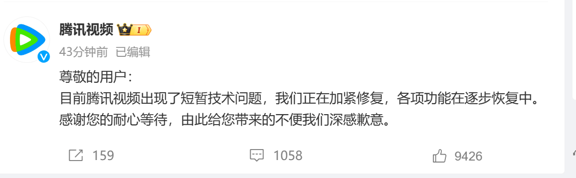 对此,腾讯视频官方微博回应:目前腾讯视频出现了短暂技术问题,我们正在加紧修复,各项功能在逐步恢复中。感谢您的耐心等待,由此给您带来的不便我们深感歉意。