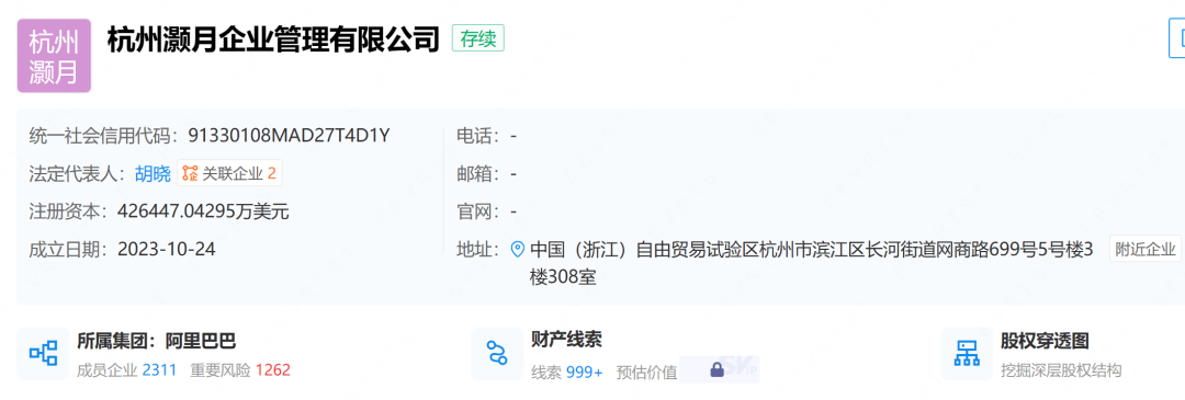 企查查显示,杭州灏月设立于今年10月24日,经营范围为企业管理、企业管理咨询、信息咨询服务等,其股东结构与阿里网络完全相同,均由淘宝(中国)软件有限公司以57.6%的持股比例控股。