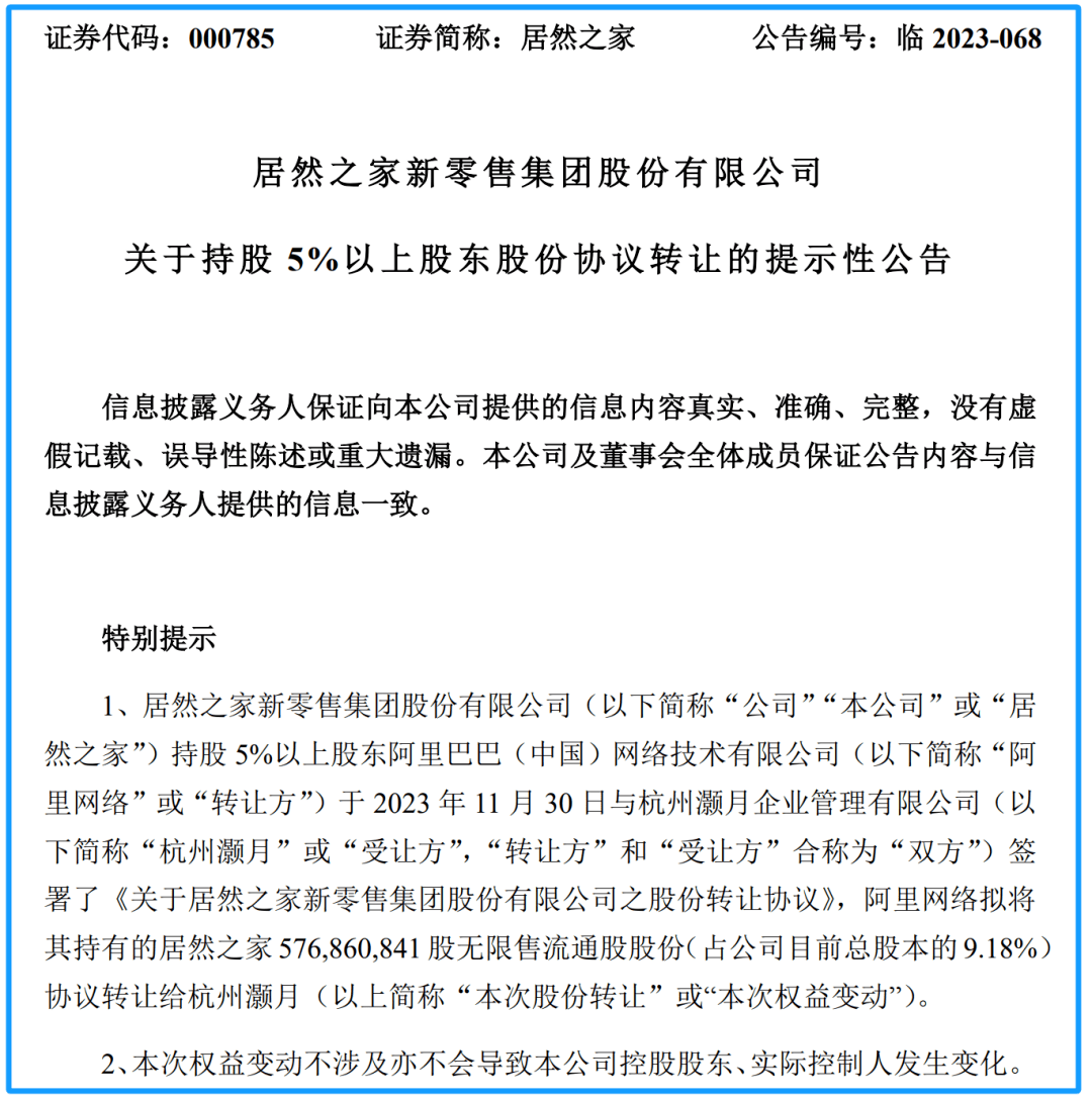 阿里网络在居然之家的持股也以同样的方式被杭州灏月承继。公告显示,阿里网络拟将所持居然之家9.18%股份协议转让给杭州灏月,转让价格为3.55元/股,转让总价为20.48亿元。转让完成后杭州灏月与一致行动人瀚云新领、阿里软件仍合计持有居然之家8.94亿股股份,占总股本的14.21%。