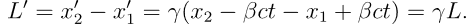 另一个推论则是长度收缩。为了给长度一个合理的定义,针对运动中的物体的两个端点必须在相同的时间进行测量,即 (x1, t) 和 (x2, t) 的时间分量必须相等。而相对物体静止的参考系中即使不同时测量也不会出现问题。利用时空变换有相对物体静止参考系中的长度 L’ 有