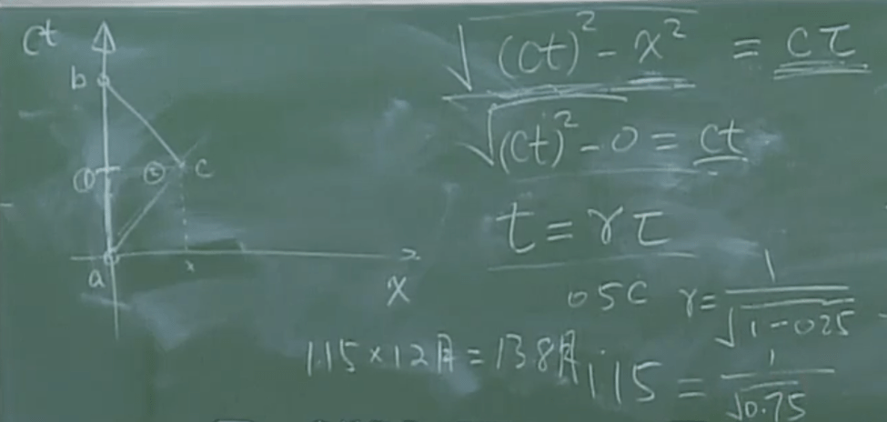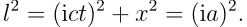 但这种光的运动过程仍然比较特别,下面考察某个实际粒子的运动。粒子同样开始时位于坐标的原点,但在它以速度 v 向 x 轴正方向运动时,一个光信号同时地发出,直到命中平行于 x 轴位于空间坐标 (vt, y) 处的一个接收器。显然,接收器的位置正是此时粒子位置沿 y 方向作平移得到的。因此在 S 系中,光信号运动的距离 ct,粒子运动的距离 x=vt 和 y 方向的距离 y 就组成了一个直角三角形。利用勾股定理可以得到: