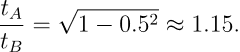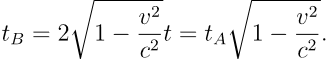 从而立即看出应当有 tA > tB,即 B 要更加年轻。近代通过实验也肯定了双生子佯谬是服从相对论的预言的。这里也可以进行一个实际例子的计算,考虑 v = 0.5c 的情况,那么