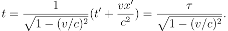 其中使用了相对静止参考系中粒子位置不发生变换。这个参考系中的时间 t’ = τ 被称为固有时。分子小于1的特性使得地面系观察到的粒子上发生的任何物理过程的时间都长于固有时。这也被称为时间膨胀。