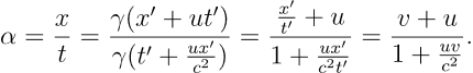 最后,来使用时空变换推导相对论的速度变换。考虑 S’ 系相对 S 系以速度 u 沿 x 轴正方向运动, S’ 系中有物体相对其以速度 v 沿着 x’ 轴正向运动。考察 S 系中物体的运动速度 α,应当有