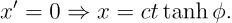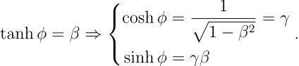 这意味着 c tanh ϕ 正应当是前面提到的参考系 S’ 相对参考系 S 的运动速度 V。不妨令 β = V/c,从而有