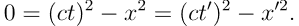 现在考虑狭义相对论中的时空,为了简单起见,暂时忽略 y,z 方向而考虑由 (ct, x) 组成的 1+1 维时空。设想参考系 S 和 S’ 在时刻 t = t’ = 0 时原点重合,S’ 系相对 S 系以速度 V 沿着 x 轴正方向运动。有一束光在 t=0 时刻从原点发出。在 S 系中的观察者来看,这束光以光速 c 运动,应当有 |x| = ct。而 S’ 系中的观察者由于光速不变原理,因此看到的同样是 |x’| = ct’。这里使用了绝对值来表示这种不变性无关于光向正向或负向运动。因此这暗示了某种不变性即