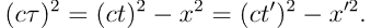 可以额外讨论 y 的物理意义,它事实上就是一个随同粒子运动的参考系中看到的,光信号沿着 y 轴运动直到命中接收器的距离,在随动参考系中的时间流逝显然同其他参考系不同,可以写出 y = c τ 来表达。这种结论同参考系无关:粒子和接收器的连线垂直于运动方向的结论在S’参考系也成立。如此,关于时空变换中的不变量有了更多的信息: