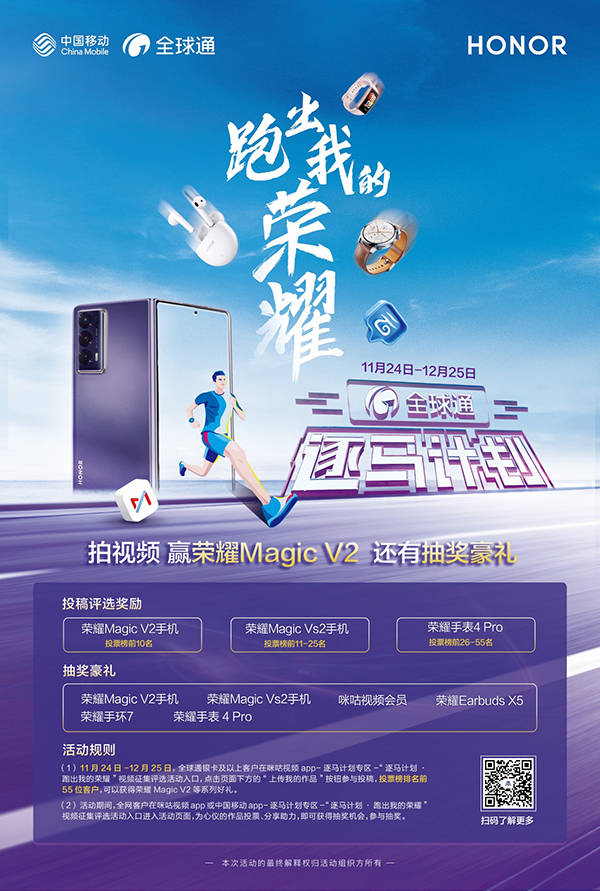 即日起至12月25日,全球通银卡及以上客户可以通过中国移动APP、咪咕视频APP进入“全球通·逐马计划”活动页面,在“跑出我的荣耀”板块参与体育运动主题的短视频投稿,投票排行榜票数前55名将获得荣耀Magic V2、荣耀Magic Vs2、荣耀手表4 Pro等好礼。用户每日参与投票、分享活动可分别获得抽奖机会,有机会抽取荣耀折叠屏手机、智能穿戴等惊喜好礼,具体细则可前往活动页面了解。