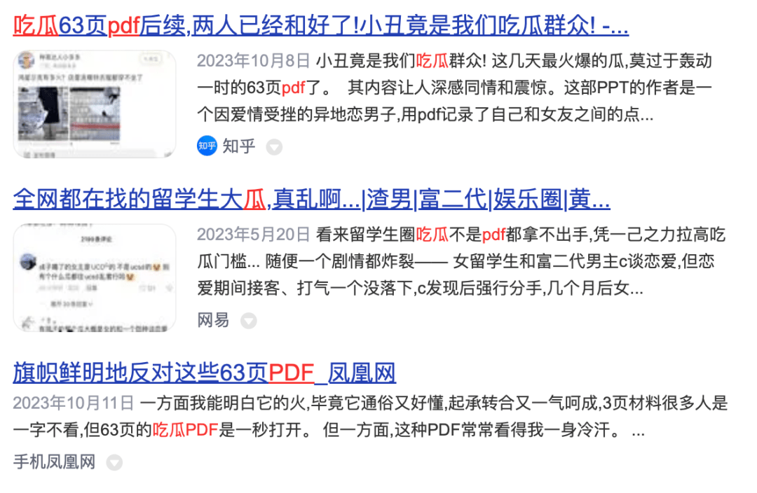 这种 PDF 式的 “ 爆料 ” 也不是一次两次了,随便用什么浏览器搜索一下 PDF 和吃瓜、爆料等关键词,一堆链接就蹦出来了。