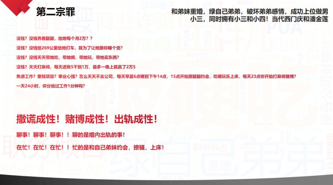 大概就是 PDF 的作者总结提炼了方某的七宗罪,这七宗罪既包括工作上的问题,如 “ 职务侵占 ” 、 “ 商业诈骗 ” ,也包括生活上的问题,如 “ 包养小三 ” 、 “ 冷暴力原配 ” ,还包括一些其他问题,像是 “ 赌博成瘾 ” 等。