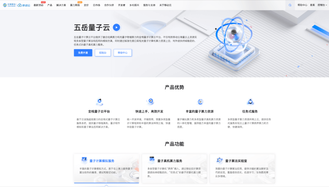 “五岳”量子计算云平台提供了融合光量子物理算力和经典算力的全栈量子计算云平台,面向科研用户群体提供云上可便捷调用的光量子计算机算力资源以及多类型量子算法和应用的模拟仿真服务。其中,“恒山光量子算力平台”实现了100计算量子比特相干光量子计算机安全接入移动云算力底座,端到端实现“数据构建、任务提交、安全鉴权、状态监控、消息互传”的一站式支持,对外提供持续稳定的、任务式的量子真机算力服务。