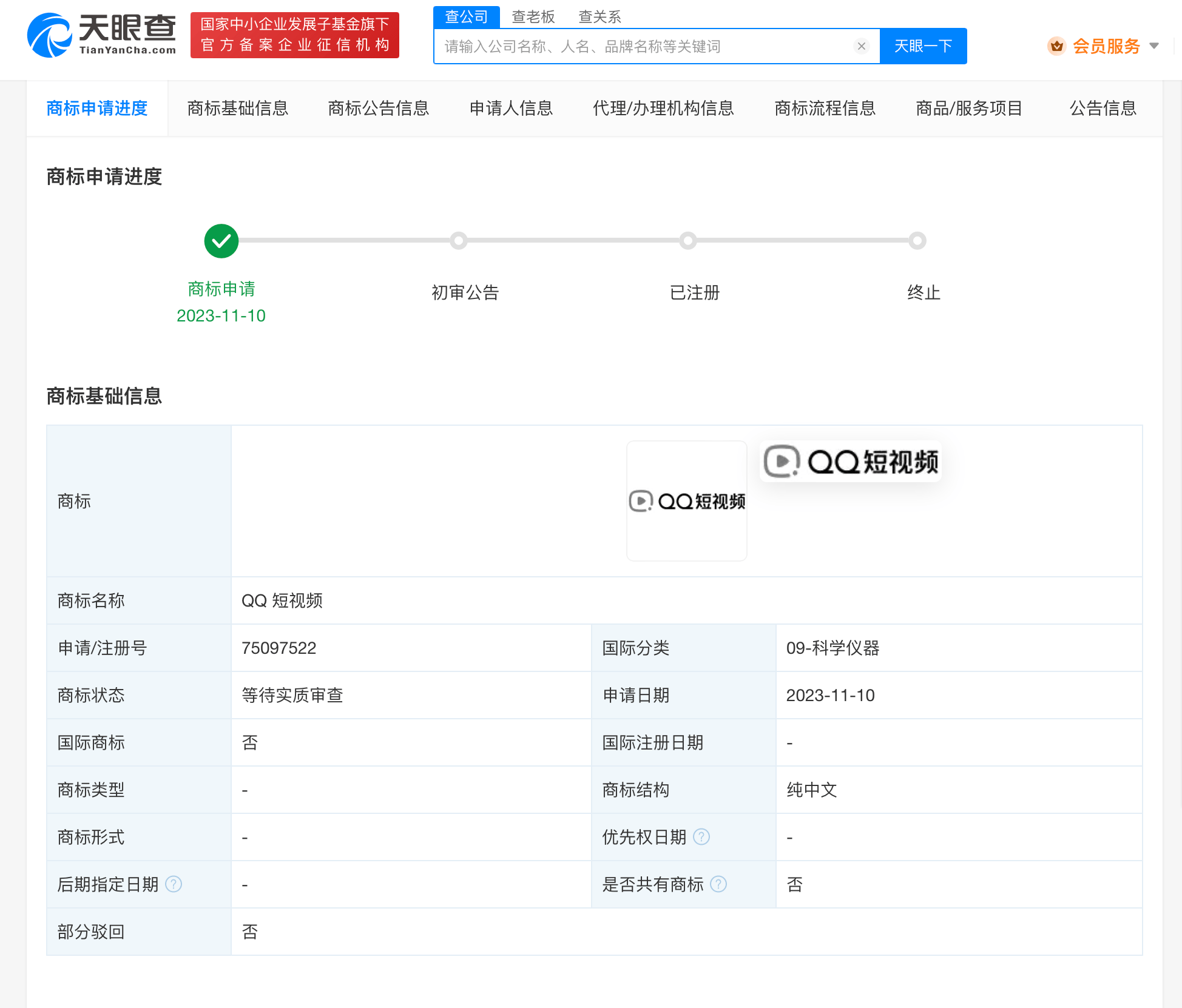 南方财经12月4日电,天眼查App显示,近日,腾讯科技(深圳)有限公司申请注册多枚“QQ短视频”商标,国际分类为通讯服务、教育娱乐、科学仪器等,当前商标状态均为等待实质审查。据媒体近日报道,腾讯QQ的“小世界”产品即将更名为“QQ短视频”,进一步强化其短视频的产品定位。来自QQ内部的消息人士称,目前在整个QQ平台上,有很多用户只看短视频,并不参与聊天。