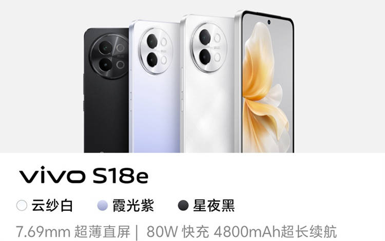 同时,这次vivo S18e新机的外观颜值也是相当的能打,机身厚度仅有7.69mm,提供有云纱白和霞光紫以及星夜黑 三种配色,后置摄像头的Deco则是圆环造型,两颗摄像头呈纵向排列,而在双摄的右侧同样有一对环形的圆圈,应该就是背面的环形柔光补光灯,而且手机内置4800mAh电池并支持80W有线充电,充电配置在这个系列产品里也算相当高了,不过目前暂时还没有这款新机的处理器和具体影像的配置消息。