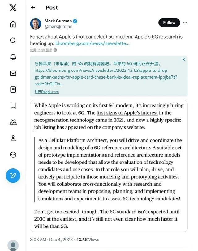 12 月 4 日消息,彭博社的马克・古尔曼在当地时间周日发表了最新一期“Power On”,谈到了苹果对 6G 技术的研发规划。同时,他在自己的 X 推文中直言,“忘记苹果的 5G 调制解调器吧,尽管它尚未被取消。苹果的 6G 研究正在升温。”