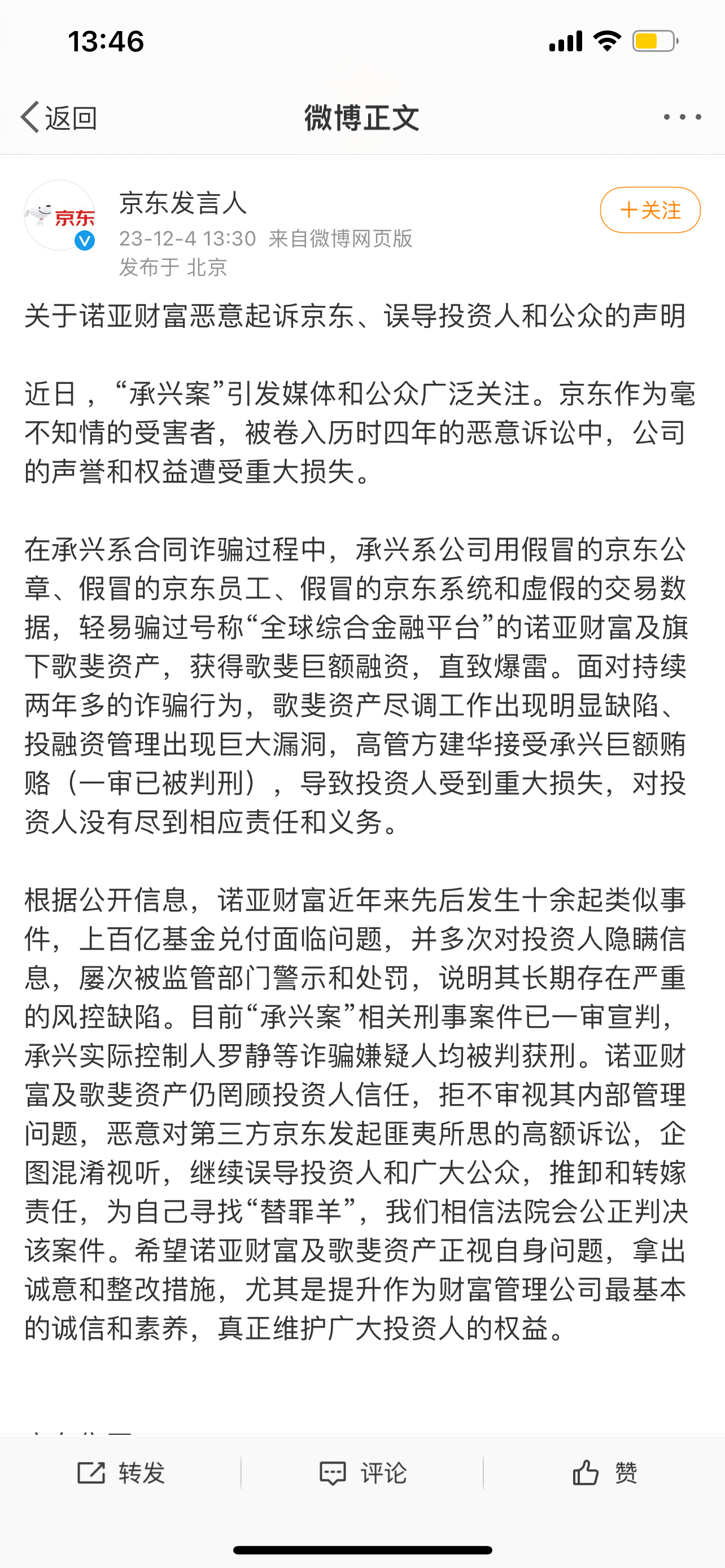 三言科技消息 京东发言人今日发布“关于诺亚财富恶意起诉京东、误导投资人和公众的声明”。