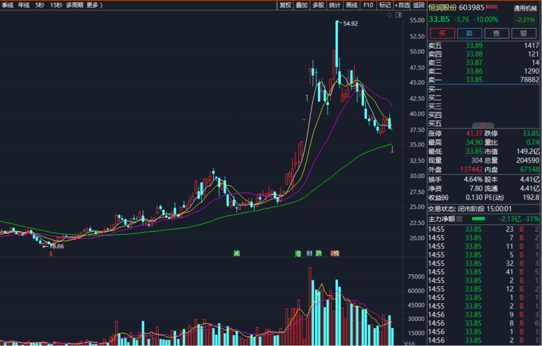 根据公开资料,恒润股份是一家精密机械制造商,公司产品涵盖风电法兰、风电轴承、燃气轮机部件、核电部件、压力容器、海上油气装备等。2023年第三季度,恒润股份的营收为4亿元,同比下降26.53%;净利为275万元,同比下降80.51%。