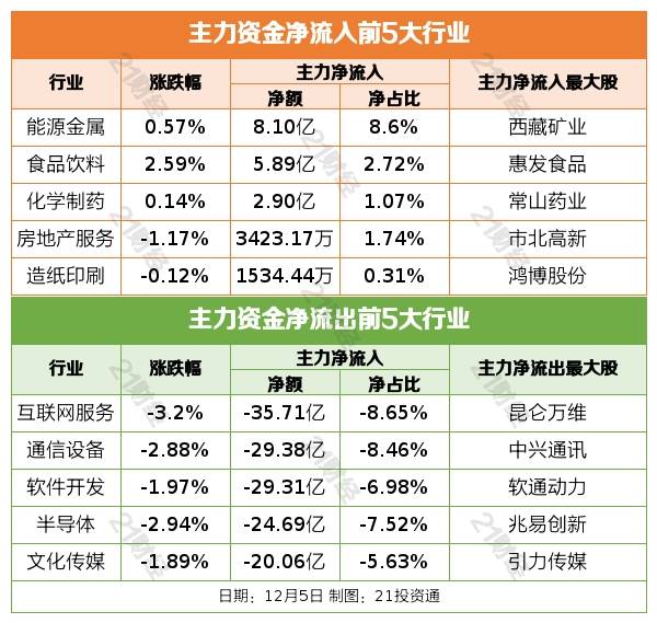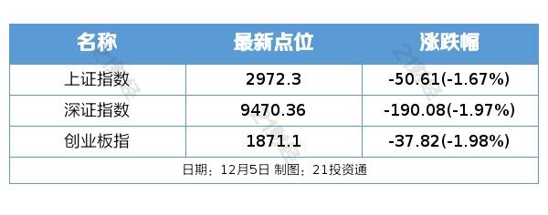 12月5日,大盘全天低开低走,三大指数均跌超1%,沪指失守3000点。截至收盘,沪指跌1.67%,深成指跌1.97%,创业板指跌1.98%。北证50指数再度大涨超7%,北交所个股全线上涨。板块方面,食品、乳业、化学制药、小家电等板块涨幅居前,华为昇腾、鸿蒙概念、存储芯片、光刻机等板块跌幅居前。