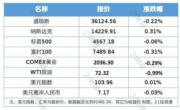 纽约股市三大股指5日涨跌不一。截至当天收盘,道琼斯工业平均指数比前一交易日下跌79.88点,收于36124.56点,跌幅为0.22%;标准普尔500种股票指数下跌2.60点,收于4567.18点,跌幅为0.06%;纳斯达克综合指数上涨44.42点,收于14229.91点,涨幅为0.31%。