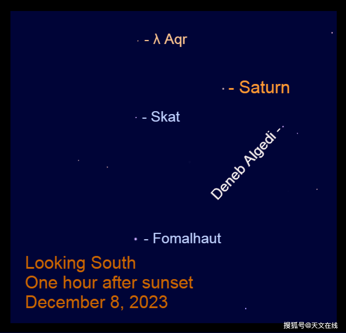 图表说明-2023年12月8日:夜幕降临,土星出现在南方的天空
