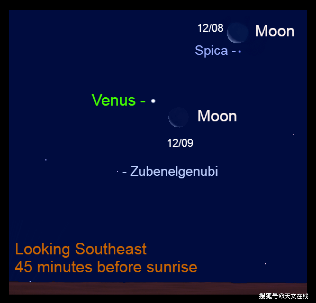 图表说明-2023年12月8日至9日:日出前,灿烂的金星在东南方。新月向东移动,经过水星和晨星。