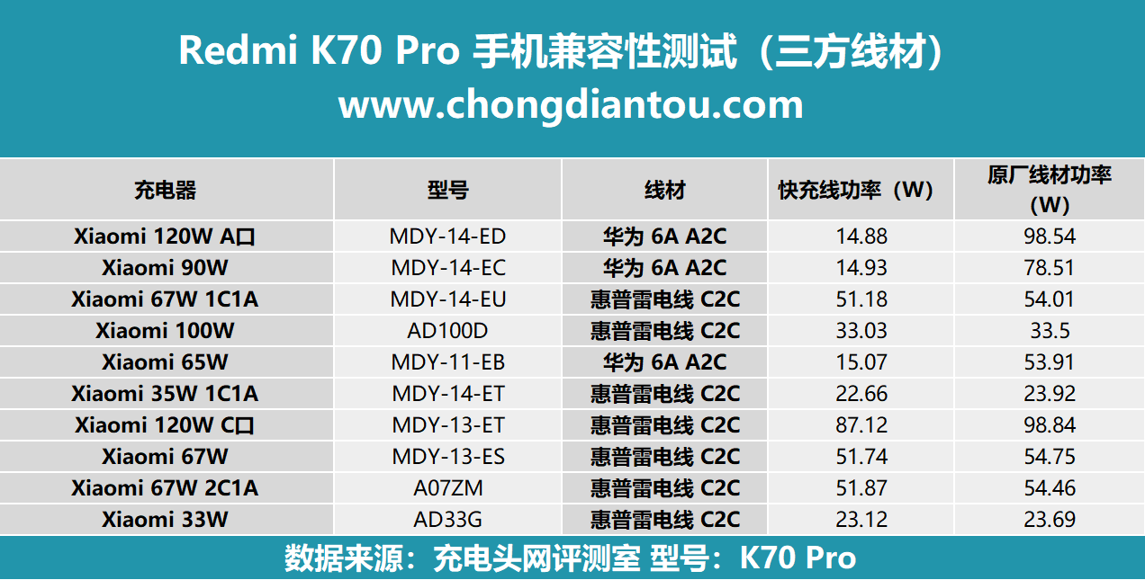 针对于三方线材的充电测试部分,将数据整理成表格,可以看出同个小米系充电器下,C to C 类型的线材的充电功率数值差异不大,而 A to C 类型线材的功率数值可相差80W。