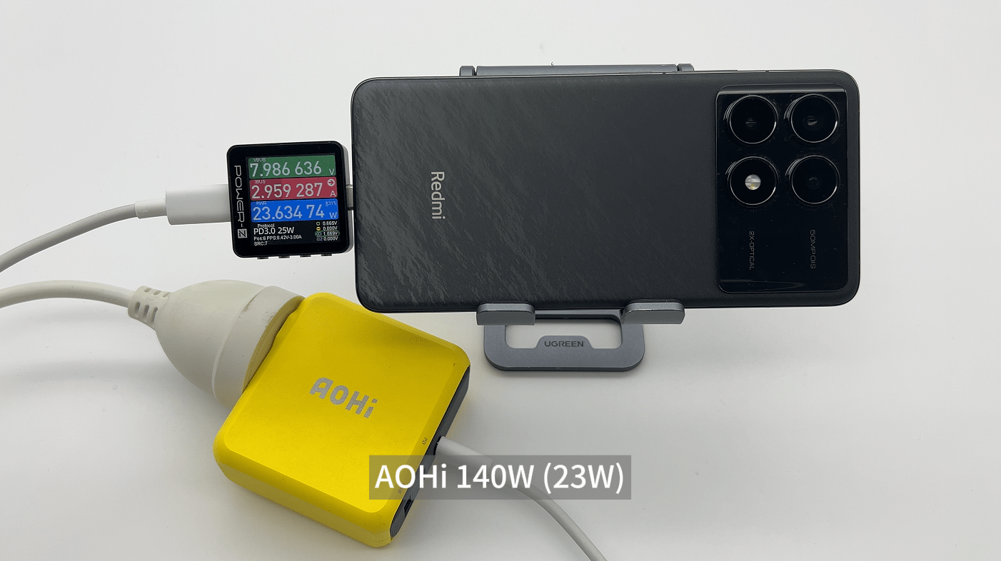 使用三方140W充电器的 Type-C 端口为 Redmi K70 Pro 手机充电,实测其功率为7.99V 2.96A 23.63W。