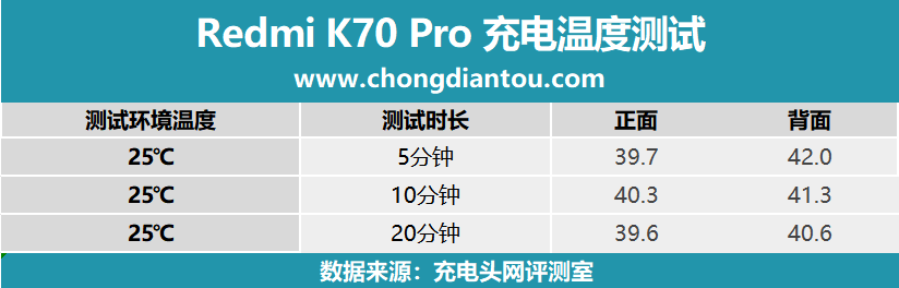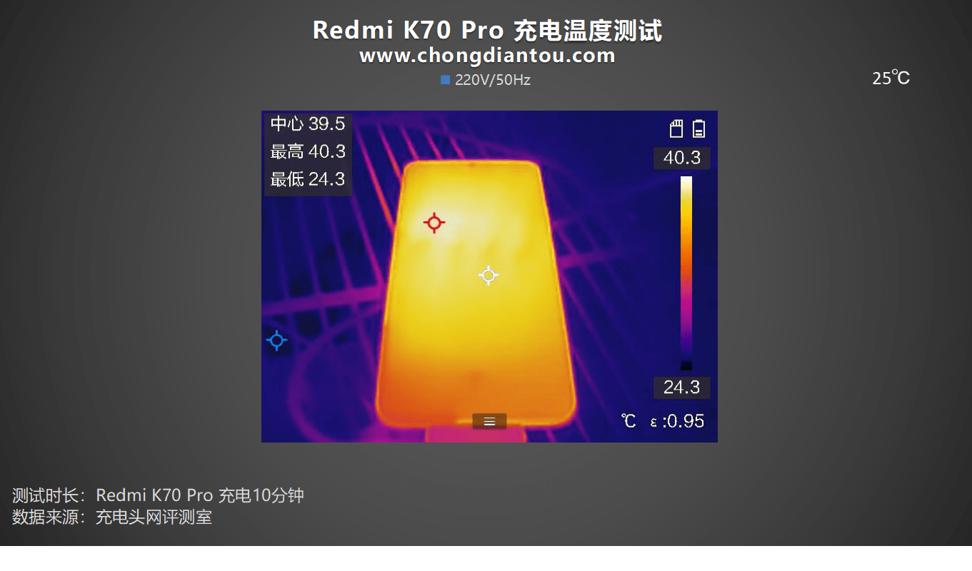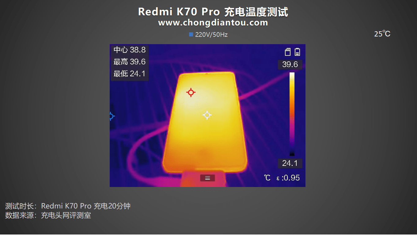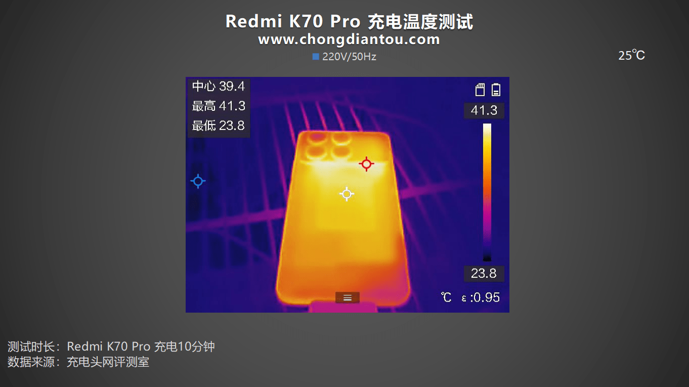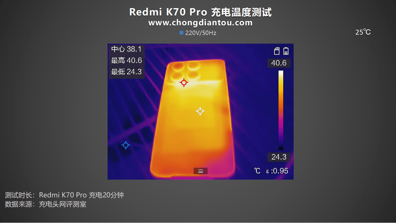 手机充电发热便是我们所需要关注的一个问题,让我们看看Redmi K70 Pro对于充电时温度的调控如何,测试全程在25℃恒温箱中进行,温度拍摄的时间点为:充电5分钟、充电10分钟、充电20分钟。