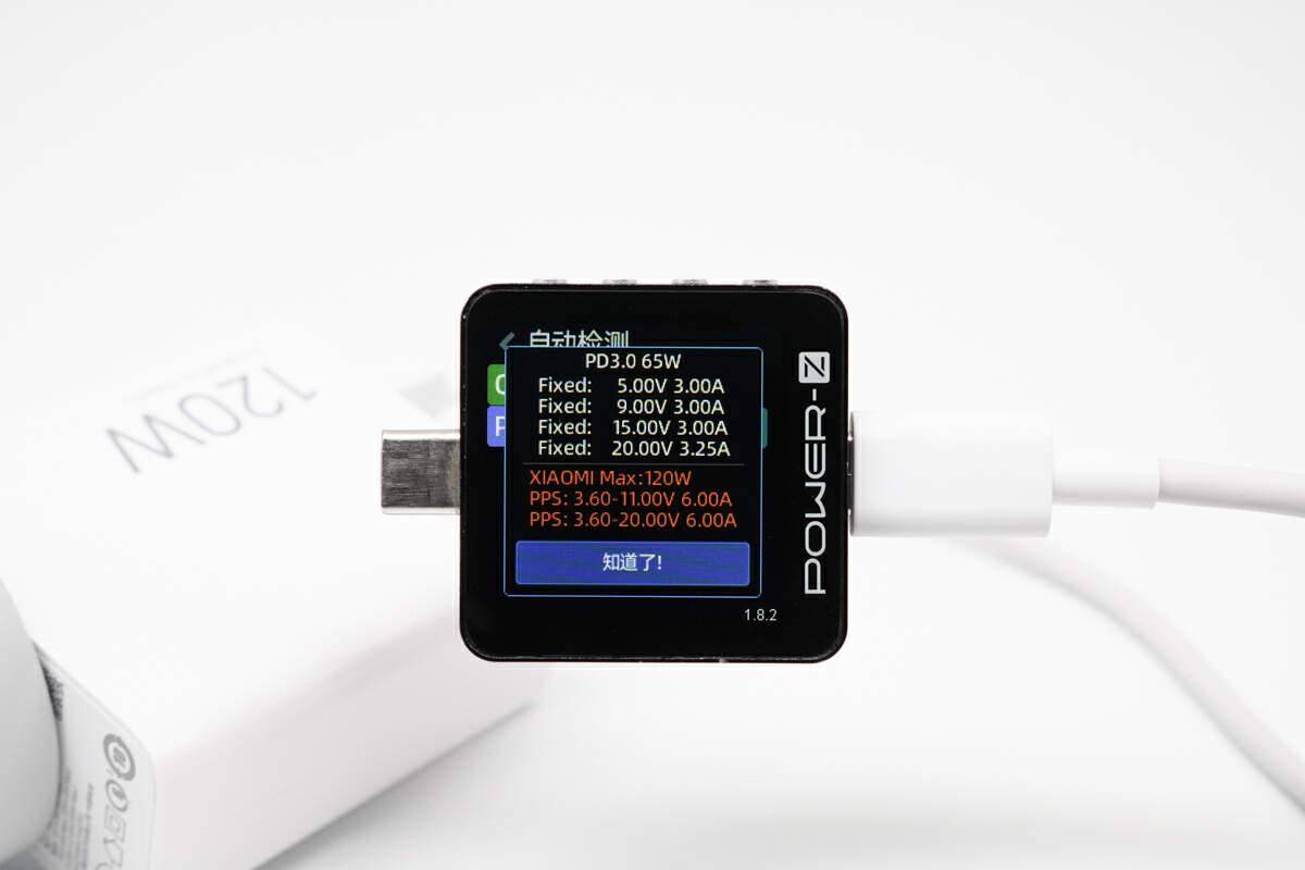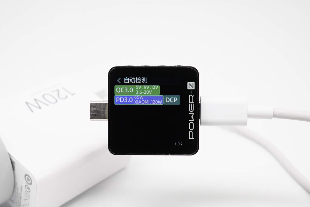 使用 POWER-Z KM003C测试仪测得USB-A端口显示 DCP、QC3.0、PD3.0以及Xiaomi 120W私有协议的快充协议。