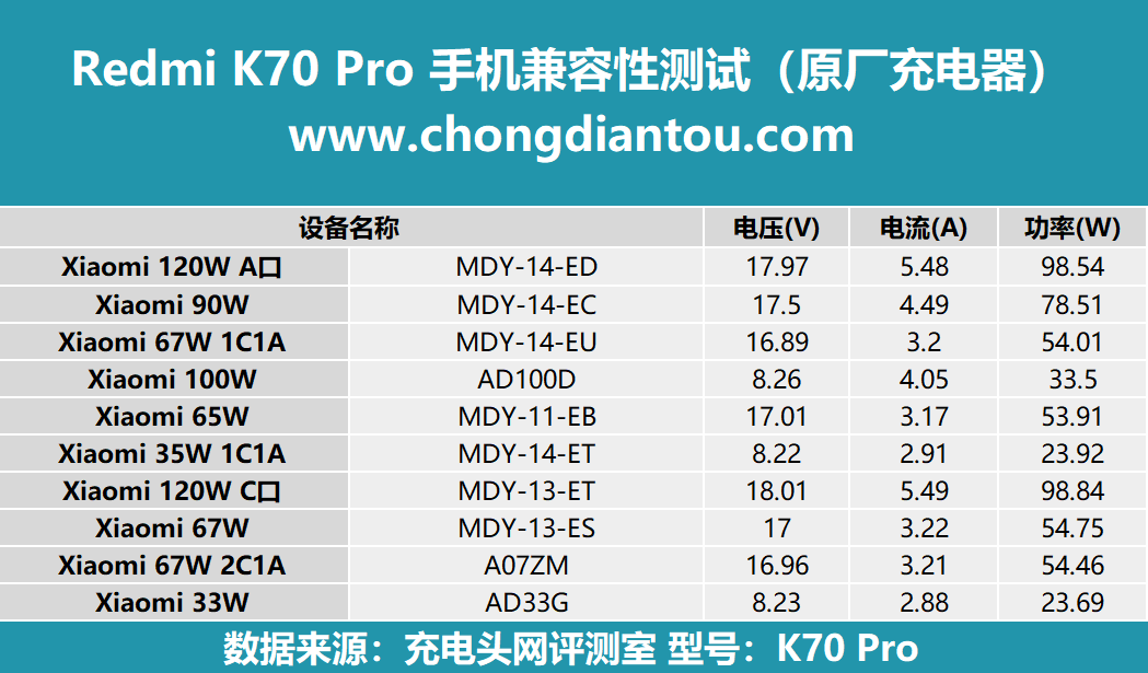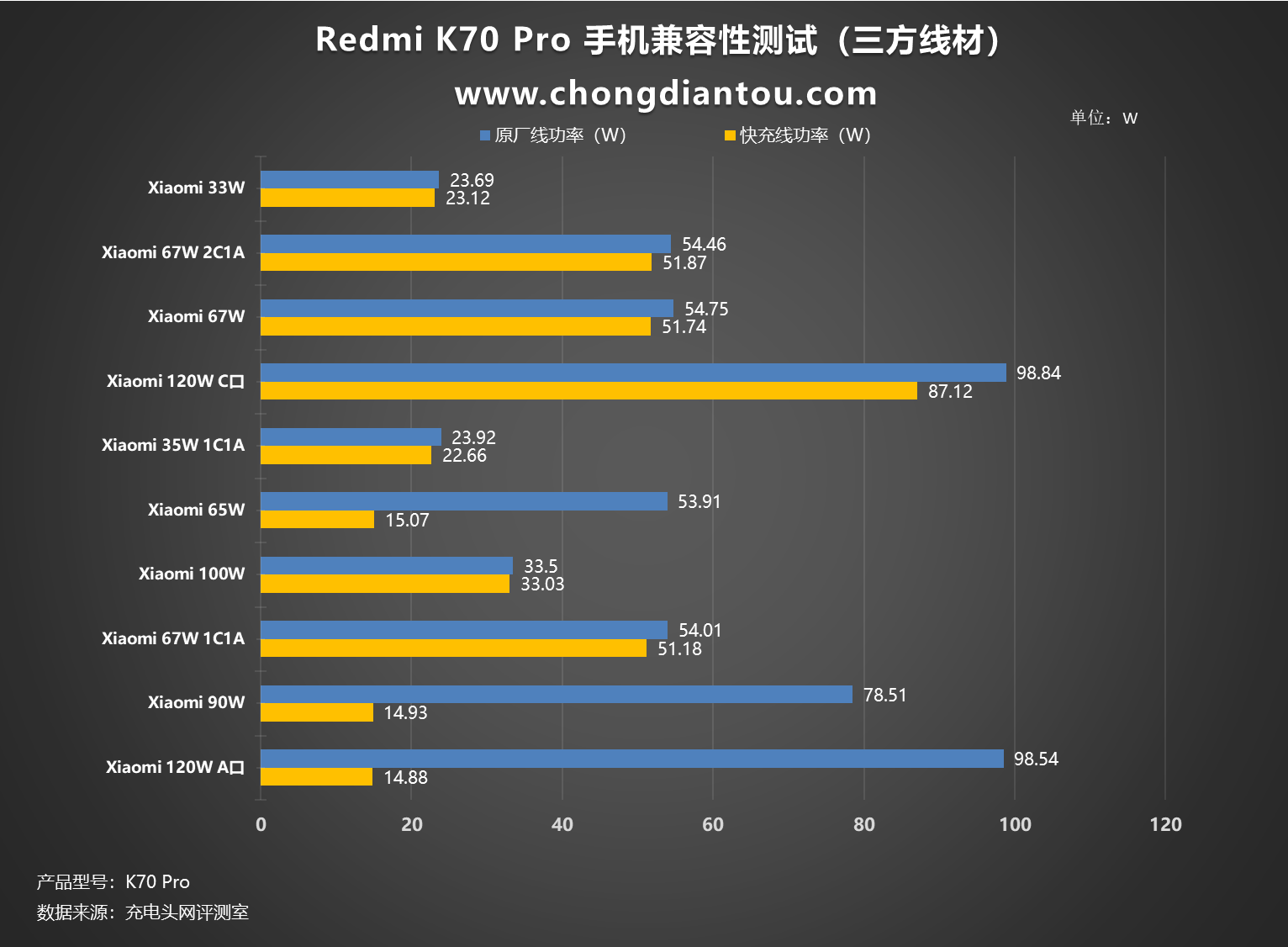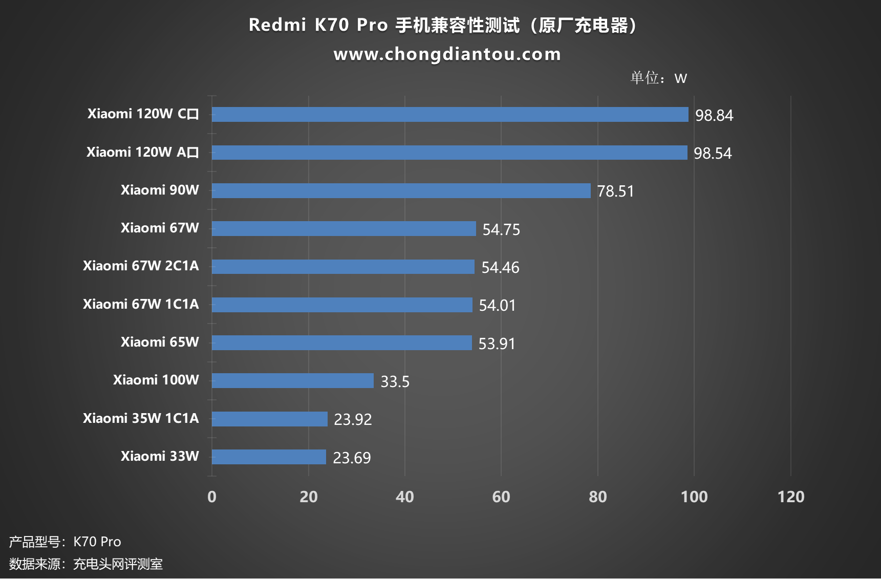 Redmi K70 Pro 配备的是120W快充套装,延续红米手机充电器的传统功率,包括先前发布的红米 K60 Pro、K50 Pro型号;以下主要针对红米最新发布的 Redmi K70 Pro手机在充电方面进行测试。