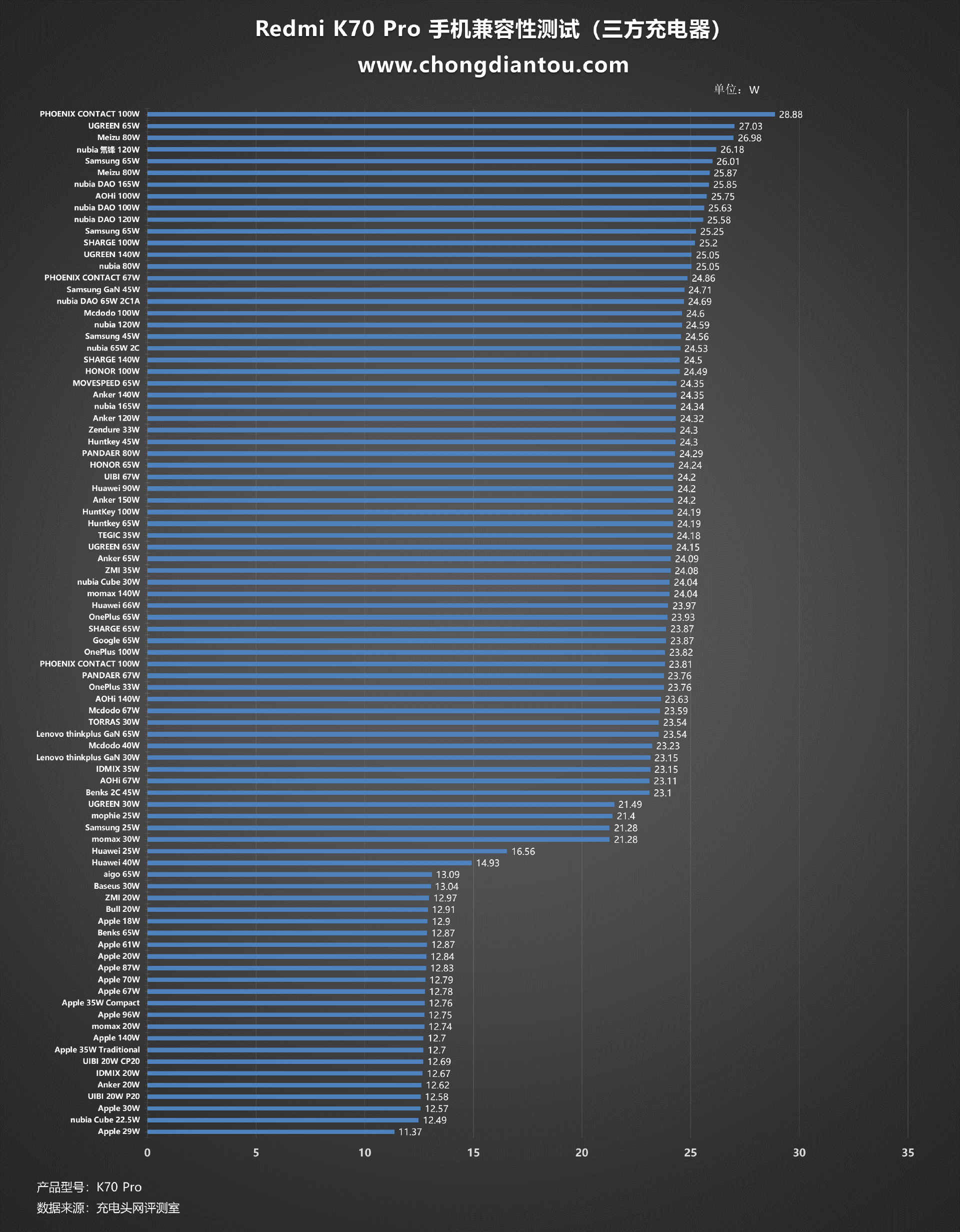 将以上测试的充电设备的数据整理为表格,可以看到,绝大多数三方充电器与 Redmi K70 Pro 手机可握手 9V 电压档位,充电功率最高为28.88W。