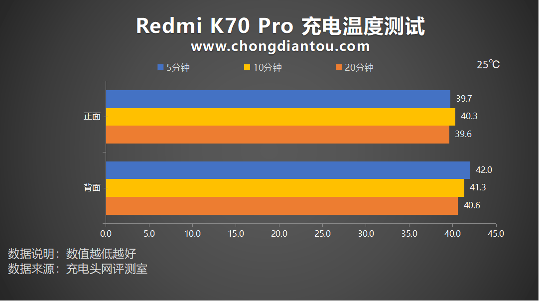 绘制出柱状图可以看出,充电过程中Redmi K70 Pro 手机背面都要比正面温度高1-2℃。正面最高温度为40.3℃,背面最高温度为42℃,充电即将结束时用手触摸手机触感温热,并没有出现烫手的情况。