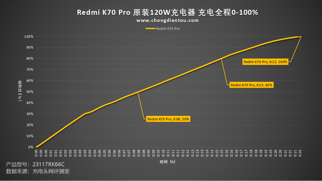 绘制出折线图,可以清楚看出使用原装120W充电器为 Redmi K70 Pro 8分钟充至50%;15分钟充至80%;从0%开始至完全充满耗时约22分钟。