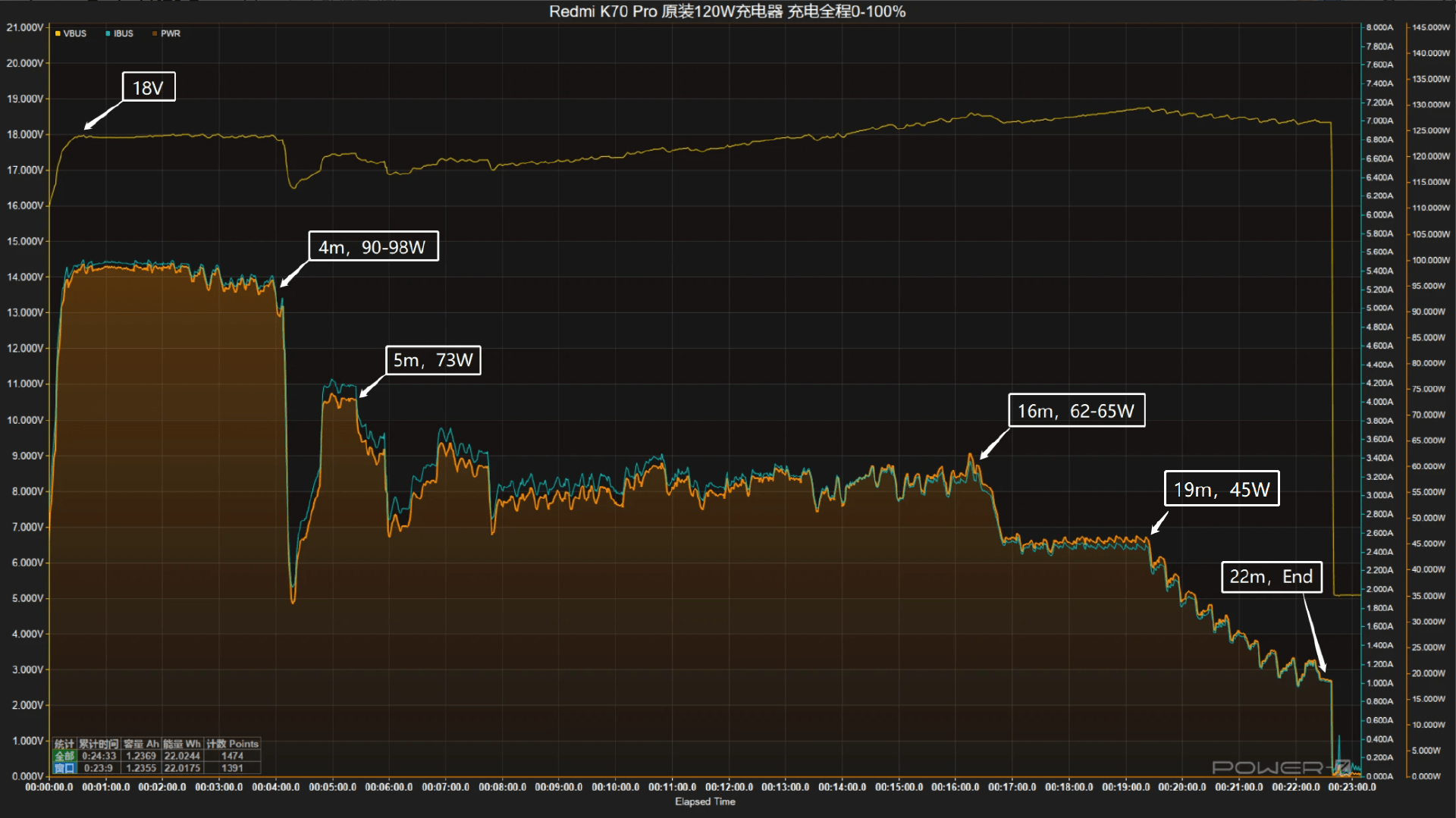 接通电源后,握手18V电压档位;前4分钟充电功率最高达到98W;随后功率下降至73W左右并持续充电至第5分钟;随后功率下降至65-62W左右并持续充电至第16分钟;随后功率下降至45W左右,并持续充电至第19分钟;之后功率不断下降,并于第22分钟充至满电。