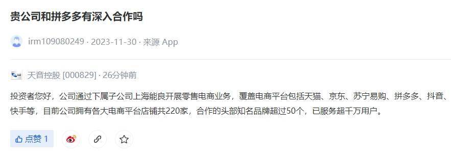 中国财富通12月6日 - 天音控股(000829)在互动平台上表示,公司通过下属子公司上海能良开展零售电商业务,覆盖电商平台包括天猫、京东、苏宁易购、拼多多、抖音、快手等,目前公司拥有各大电商平台店铺共220家,合作的头部知名品牌超过50个,已服务超千万用户。