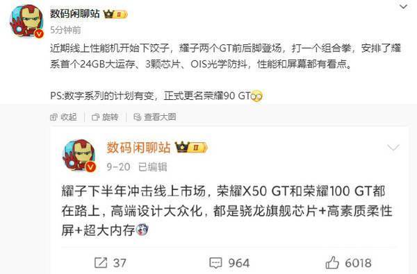 该博主发微博称:近期线上性能机开始下饺子,耀子两个GT前后脚登场,打一个组合拳,安排了耀系首个24GB大运存、3颗芯片、OIS光学防抖,性能和屏幕都有看点。根据博主发布的截图,这两款GT新机分别是荣耀X50 GT和荣耀90 GT。