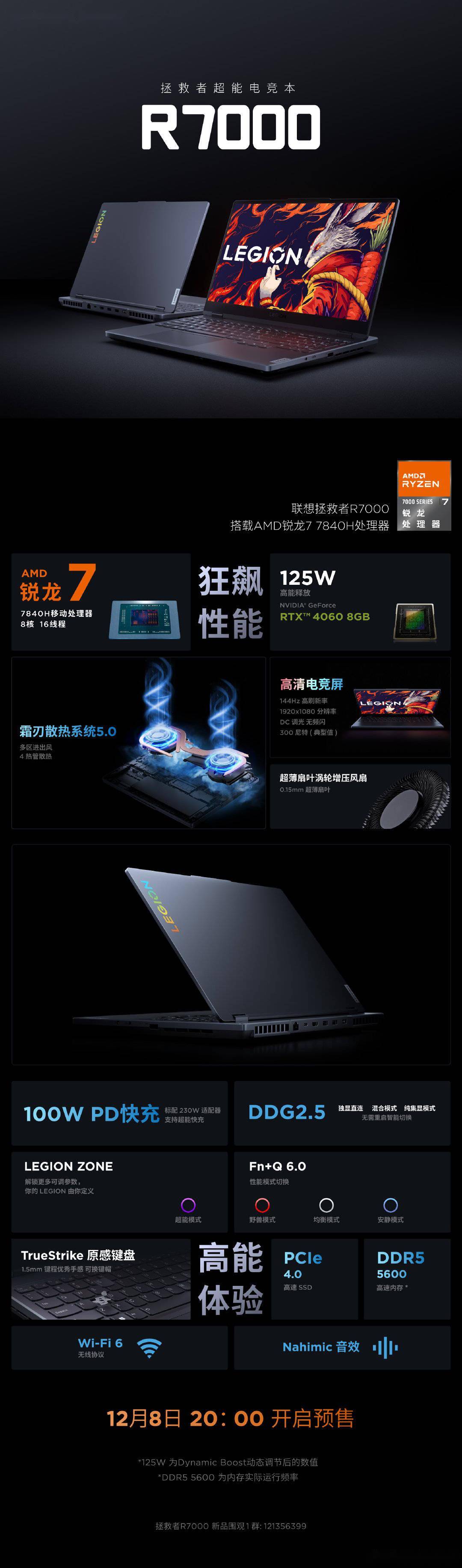 IT之家 12 月 6 日消息,联想宣布将推新款拯救者 R7000 游戏本,处理器升级到 R7 7840H,将于 12 月 8 日晚 8 点预售。