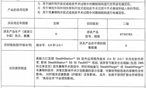 美敦力(上海)管理有限公司报告,由于StealthStation S8软件应用程序版本2.0和2.0.1中存在软件异常等原因。生产商美敦力导航股份有限公司对其生产的脑外科手术导航系统(国械注进20183010514)、脊柱外科手术导航系统(国械注进20183010510)、耳鼻喉科手术导航系统(国械注进20183010507)主动召回。