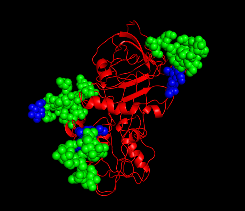 蛋白质(红色)与聚糖(蓝色和绿色)结合糖基化。图片来源:马萨诸塞大学阿默斯特分校