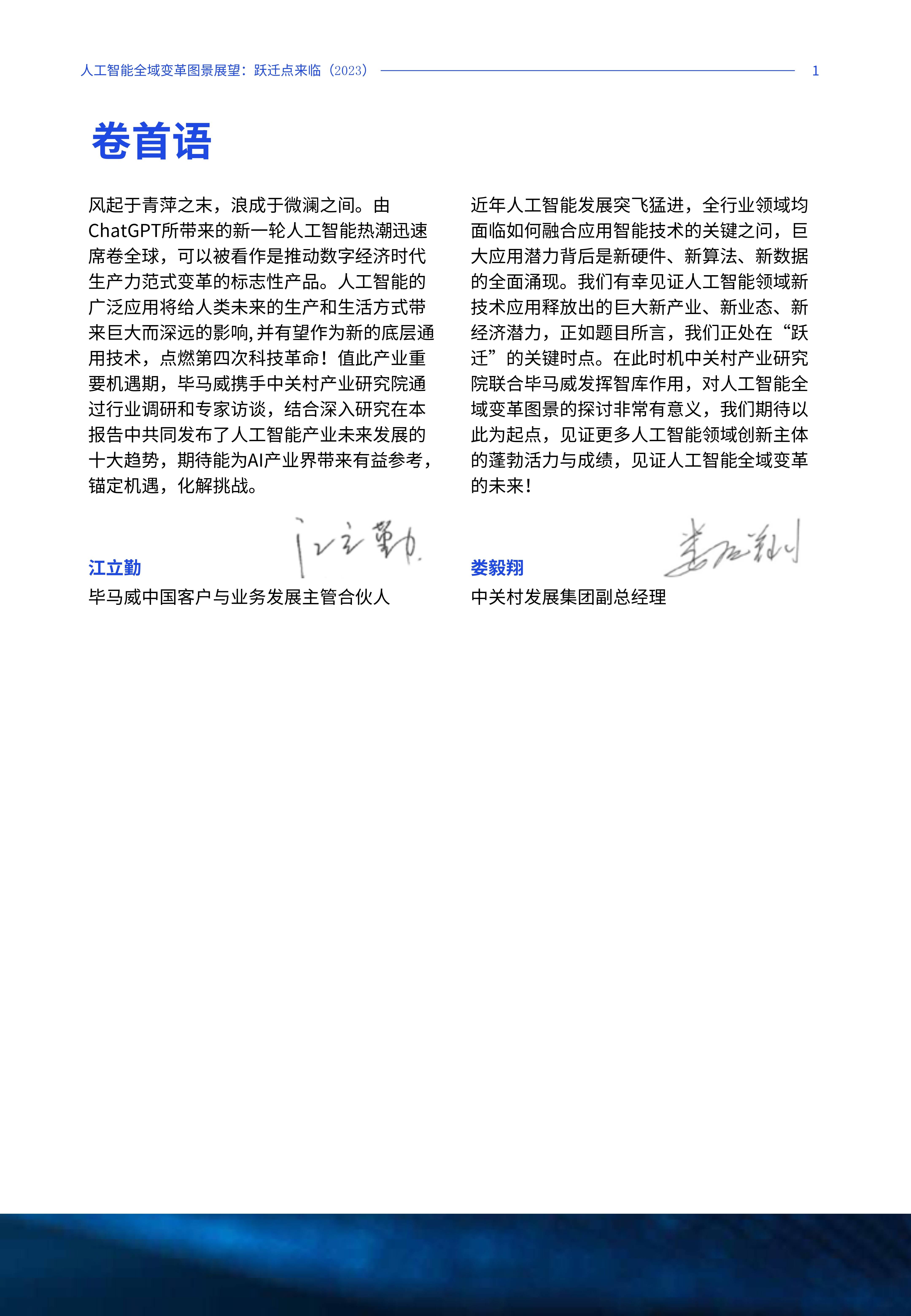 近年人工智能发展突飞猛进,全行业领域均面临如何融合应用智能技术的关键之问,巨大应用潜力背后是新硬件、新算法、新数据的全面涌现。我们有幸见证人工智能领域新技术应用释放出的巨大新产业、新业态、新经济潜力,正如题目所言,我们正处在“跃迁”的关键时点。在此时机中关村产业研究院联合毕马威发挥智库作用,对人工智能全域变革图景的探讨非常有意义,我们期待以此为起点,见证更多人工智能领域创新主体的蓬勃活力与成绩,见证人工智能全域变革的未来!