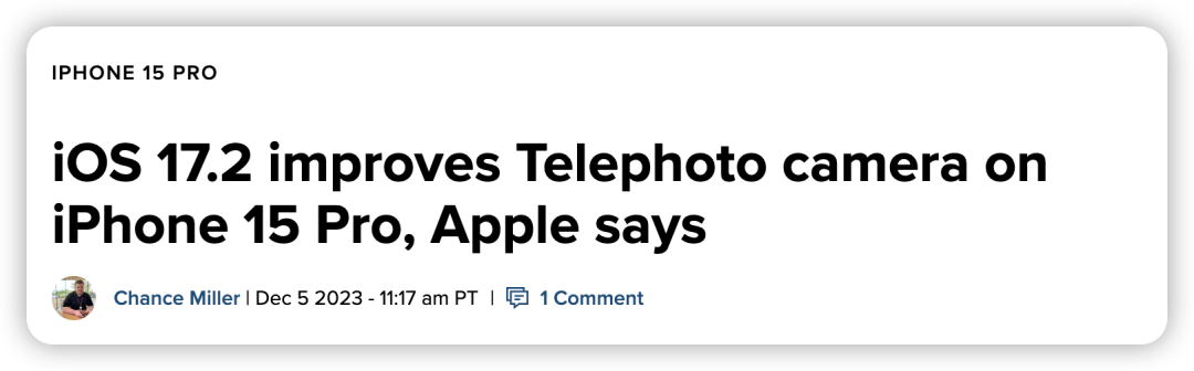 苹果在 iOS 17.2 RC 版的支持文档中表示,iPhone 15 Pro 系列机型在升级最新 RC 版系统后,长焦镜头性能将迎来一波优化。