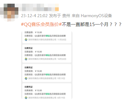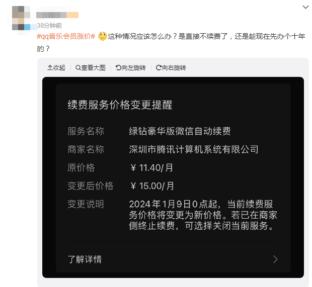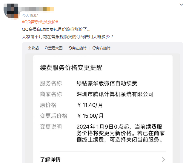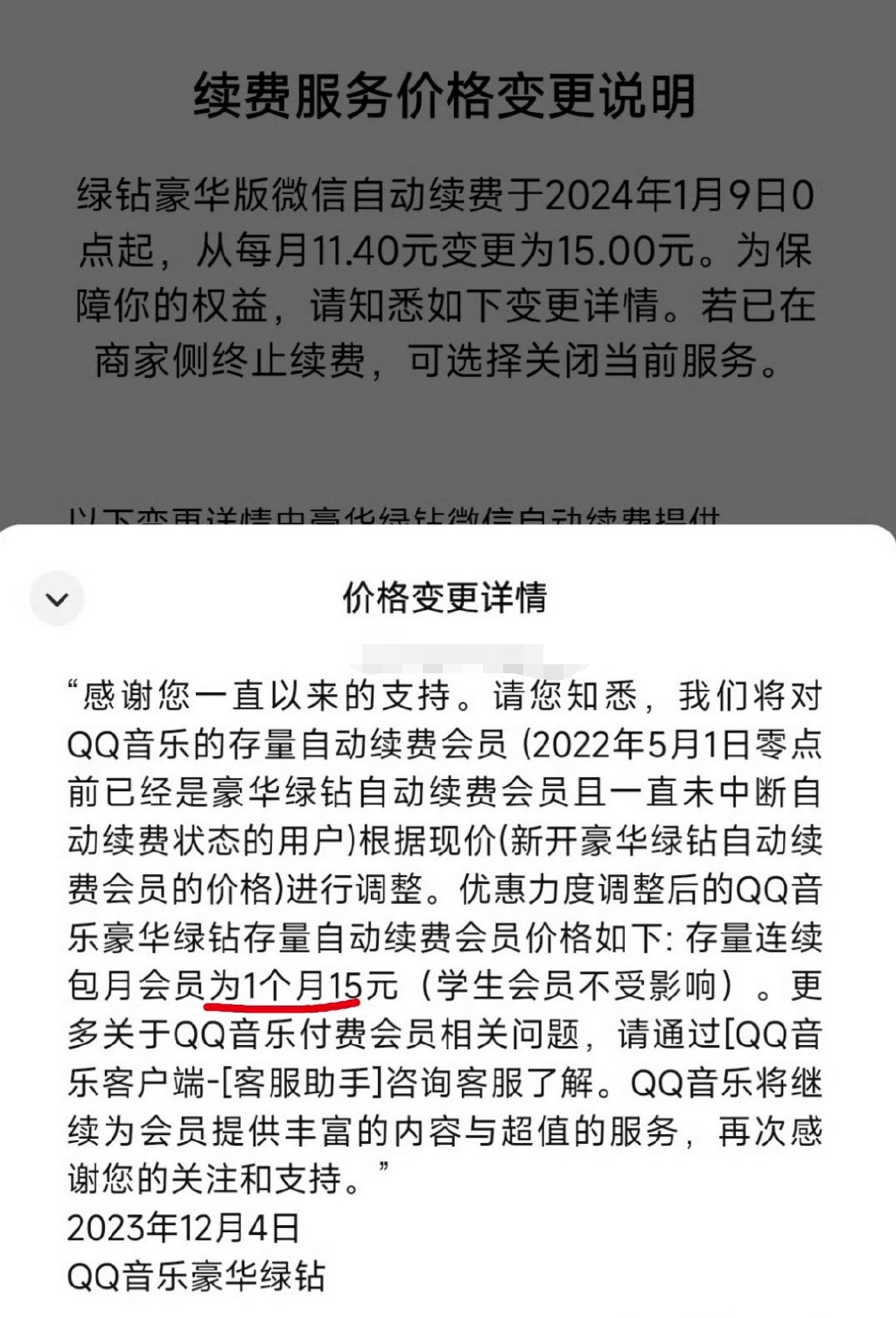 12月4日,有网友发文称,QQ音乐日前向微信用户发送“续费服务价格变更提醒”:2024年1月9日0点起,绿钻豪华版微信自动续费的费用将从11.4元/月变更至15元/月。