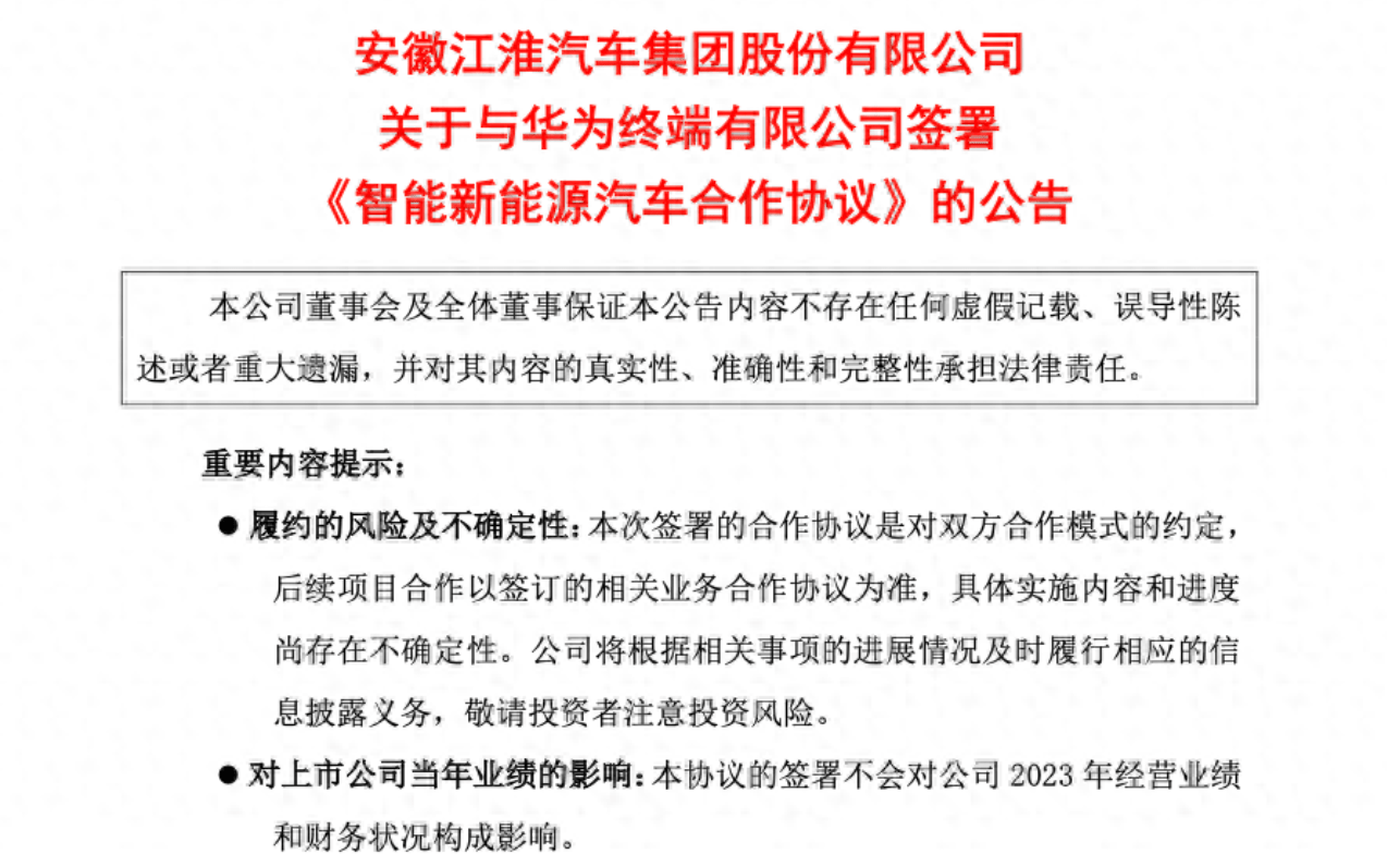 12月1日,江淮汽车发布公告称,与华为终端有限公司签署《智能新能源汽车合作协议》,双方将着力打造豪华智能网联电动汽车。根据协议,双方将基于华为智能汽车解决方案,在产品开发、生产制造、销售、服务等多个领域全面合作。该协议自签订之日起10年内有效。其中,江淮汽车负责打造生产基地及合作车型开发,华为则提供销售服务。