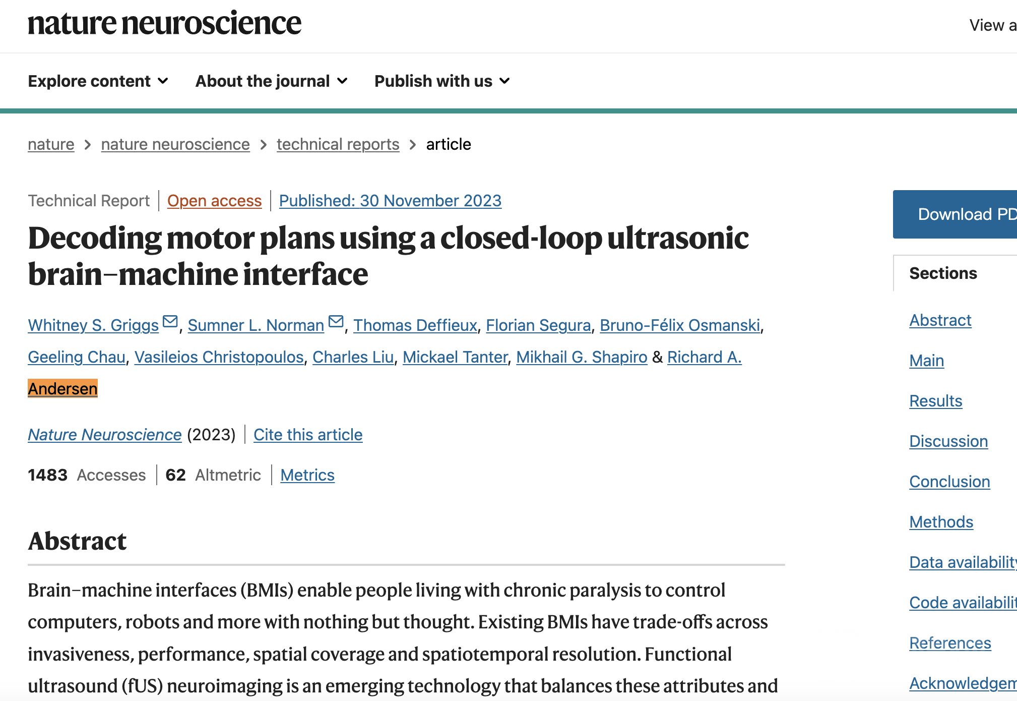 这次,Richard Andersen教授团队以“使用闭环超声脑机接口解码运动计划”为题,将fUS技术在脑机接口领域的研究和实验过程信息发表在顶级学术期刊《自然·神经科学》杂志中。