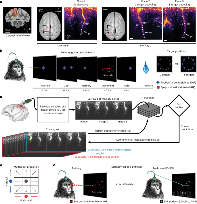 其次,论文中指出,为了表明这一方法可成功实施,实验团队进行了一场恒河猴身上的脑机接口动物实验。通过在两只恒河猴进行眼睛和手部运动时的后顶叶皮层传输fUS数据,来测量非人灵长类动物顶叶后皮质(PPC)的大脑活动——规划并帮助执行运动。实验期间,研究人员训练恒河猴,并且使得实验动物被教会了两项任务:移动手来引导屏幕上的光标,移动眼睛看屏幕的特定部分。它们只需要考虑执行任务,而不是实际移动眼睛或手,因为脑机接口可以读取它们的大脑活动。